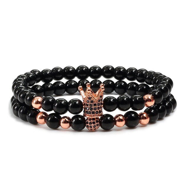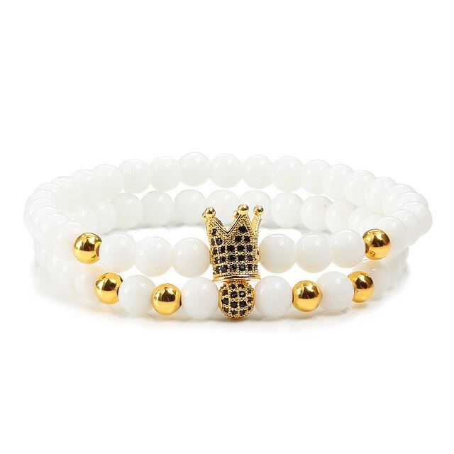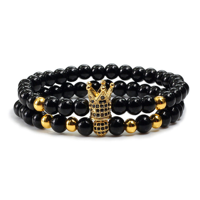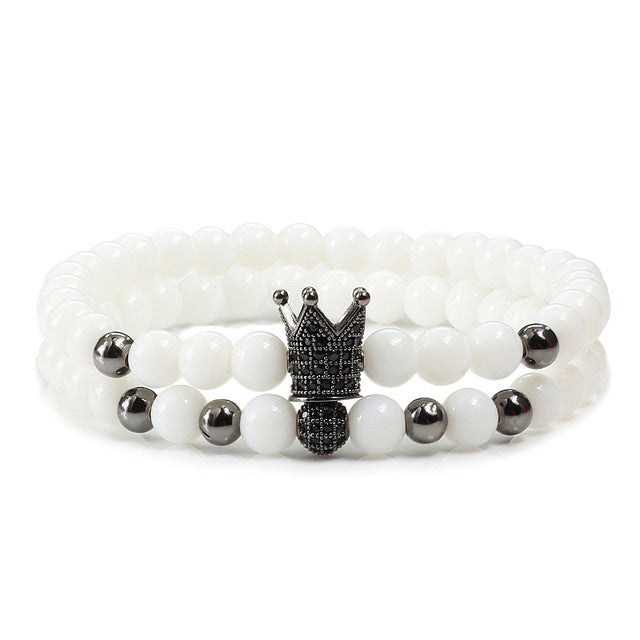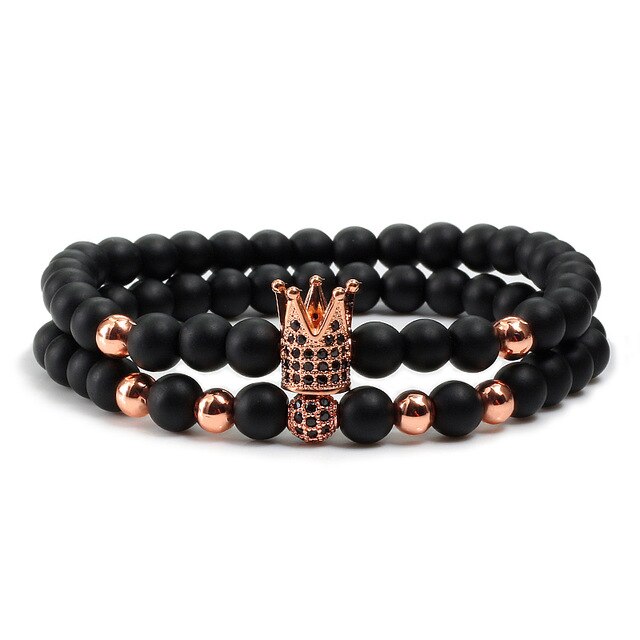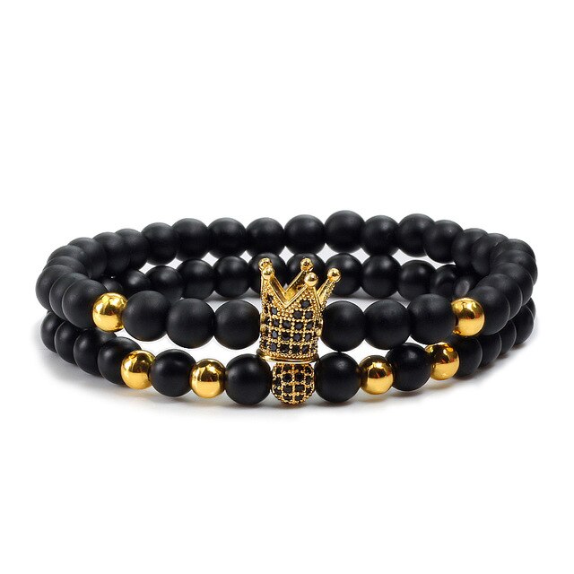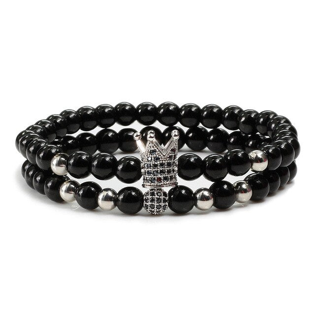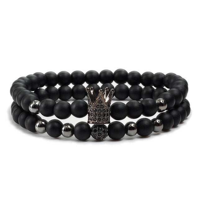2pcs/set Matte Oxyn Stone Beads Bracelet Men Sliver Crown Bracelet